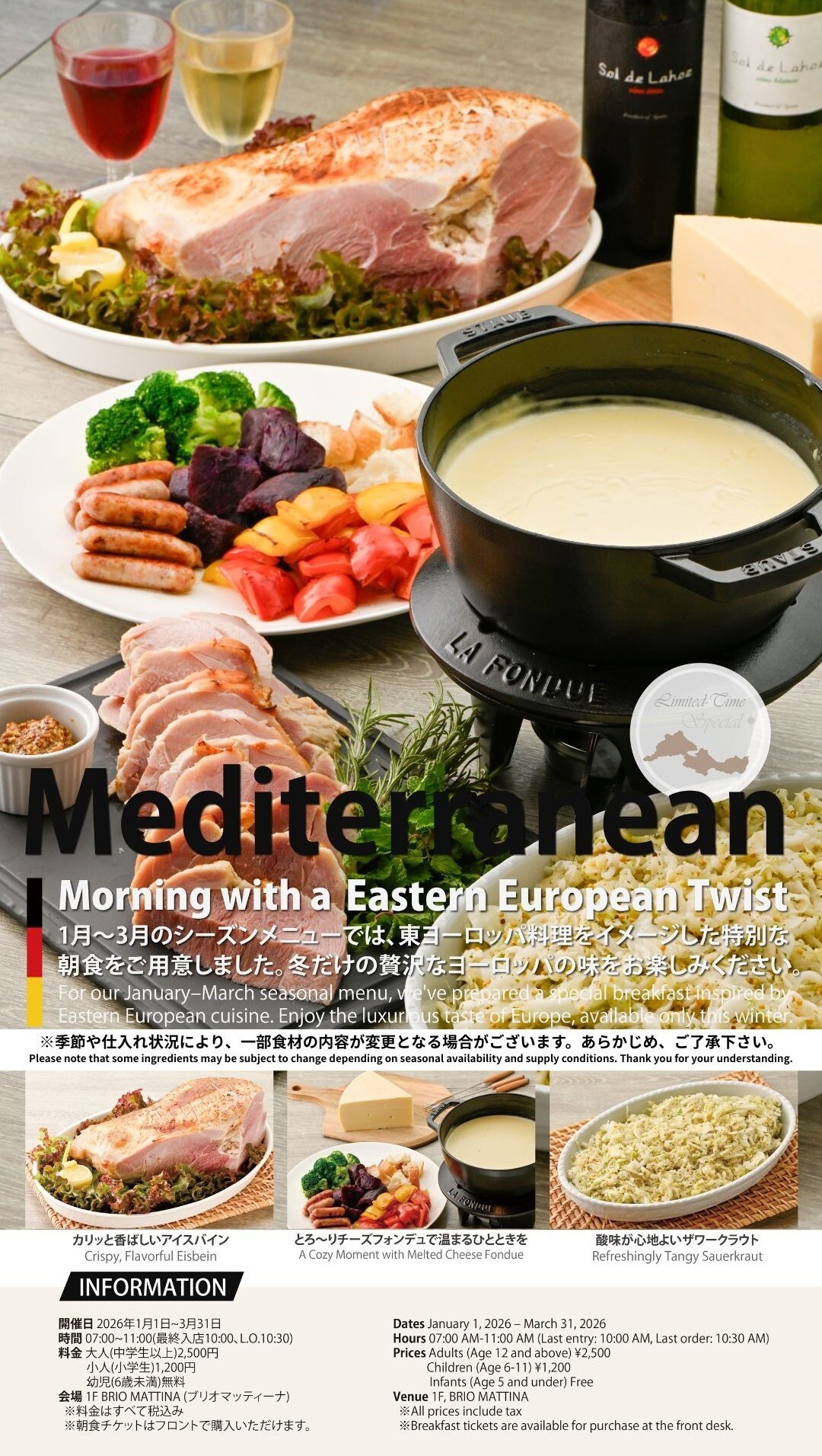 ●沖縄県産豚もも肉のアイスバイン(ドイツ・ベルリン名物) – 豚もも肉を塩漬けし、香味野菜とともにじっくり長時間煮込んだ一品 – ほろほろに柔らかい肉質と、野菜の旨みが溶け込んだスープは、朝から満足度大! – 粗挽きマスタードやビネガーを添えて、さっぱりとどうぞ ●ラクレット風チーズフォンデュ(スイス) – とろ~りクリーミーでマイルドなラクレットチーズをテーブルで溶かします – じゃがいも、パン、旬の野菜をくぐらせれば、香り高くコクのある贅沢な味わいに – 白ワイン(辛口)との相性抜群!チーズ好きにはたまらない一皿です ●ザワークラウト(ドイツ) – 塩漬け発酵させた刻みキャベツは、爽やかな酸味とシャキシャキ食感が魅力 – 脂っこい料理の口直しにぴったり!アイスバインやソーセージとともにどぞ – 発酵食品ならではのヘルシーさも嬉しいポイント この機会にぜひ、ヨーロッパの味覚めぐりを楽しむ“特別な朝”をお過ごしください♪