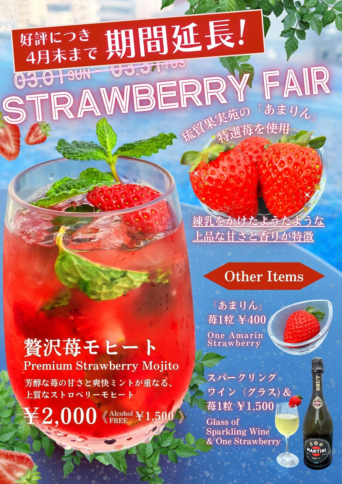 昨年金賞を受賞したブランド苺「あまりん」を贅沢に使用したストロベリーモヒート。