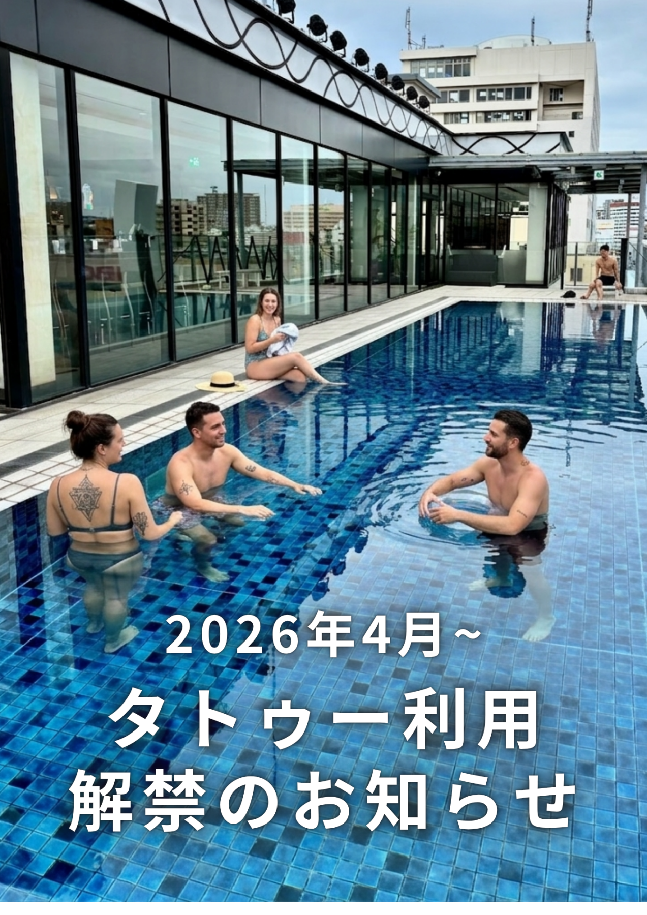 アクアチッタでは、2026年4月よりタトゥーがある方も全時間帯でプールをご利用いただけることとなりました。